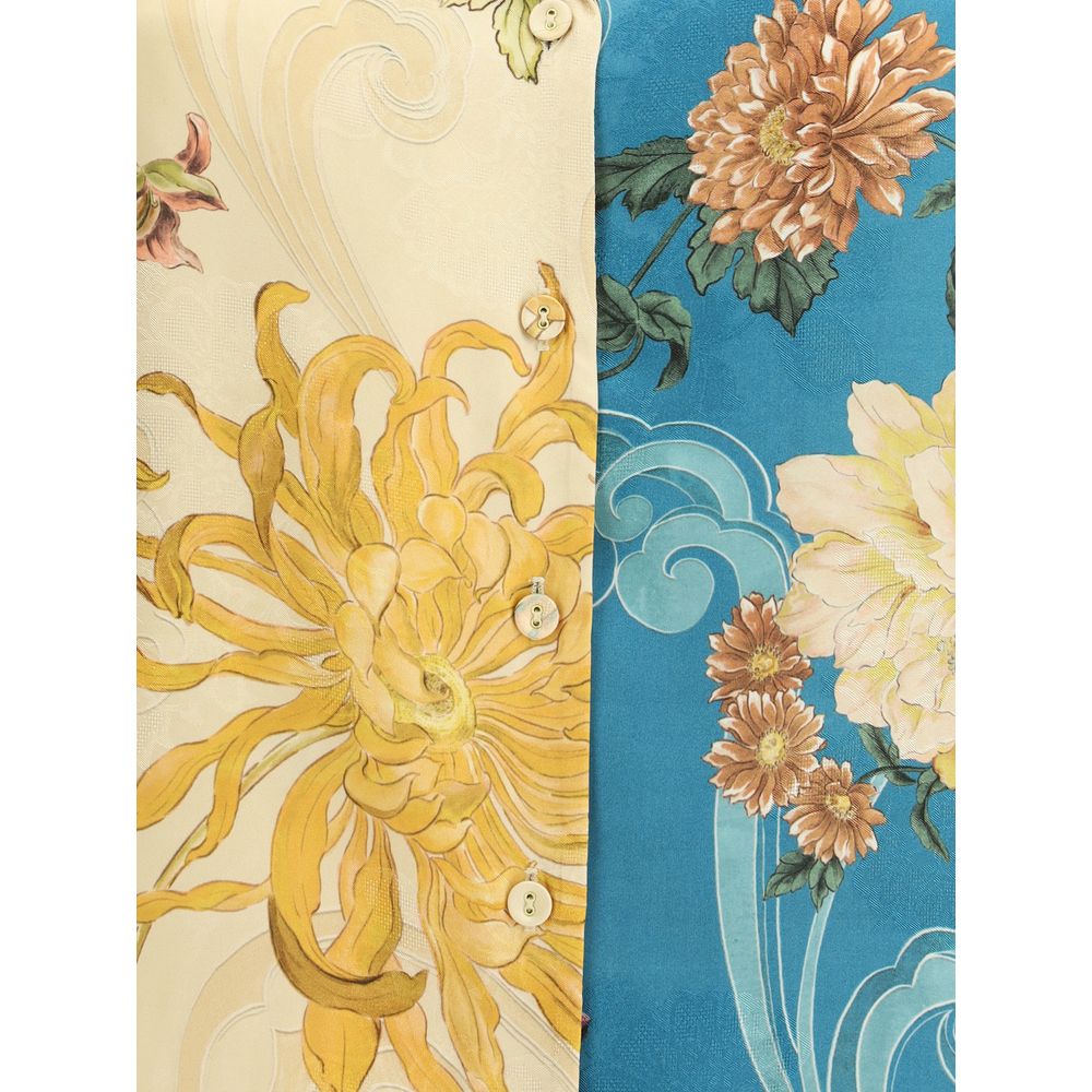 The Avery Shirt by Alemais is a feminine and sophisticated garment made from fluid silk and embellished with a vibrant multicolored floral pattern. The design is complemented by a classic lapel and a front button closure for a refined yet casual style perfect for summer.